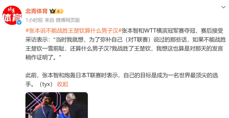 此前,张本智和炮轰日本T联赛时表示,自己的目标是成为一名世界最顶尖的选手。